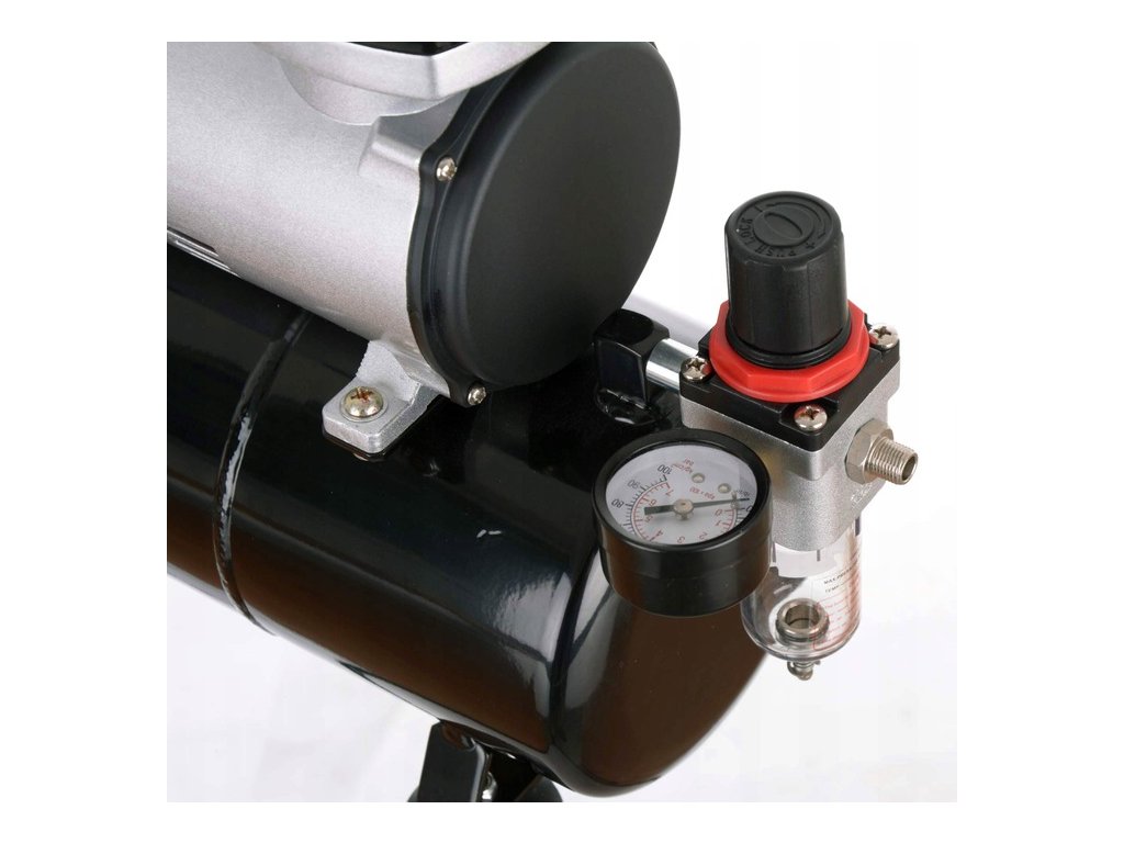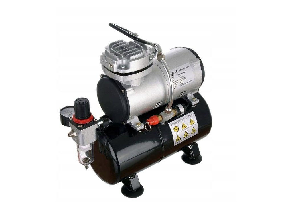 PRÁCE - kompresor pracuje s airbrushes s tryskami od 0,2 do 0,8 mm. Díky vysokému výkonu a konstrukci s válcovým válcem (chlazení). Láhev stabilizuje vzduch (bez pulzace)
