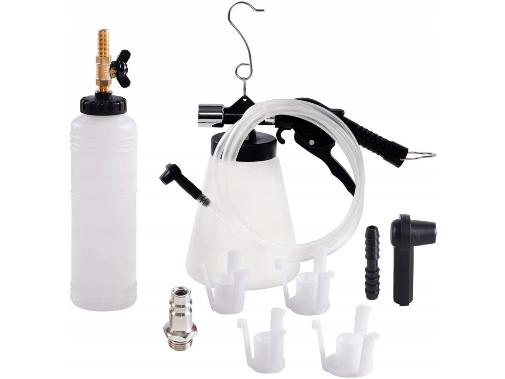 Zařízení na výměnu brzdové kapaliny a odvzdušnění brzdového okruhu Velmi kvalitní provedení, výborný pomocník Souprava umožňuje svobodný výkon naplnit a odvzdušnit brzdový systém s tlakem 6-8 bar (90-120 PSI) pneumatického systému (kompresor).