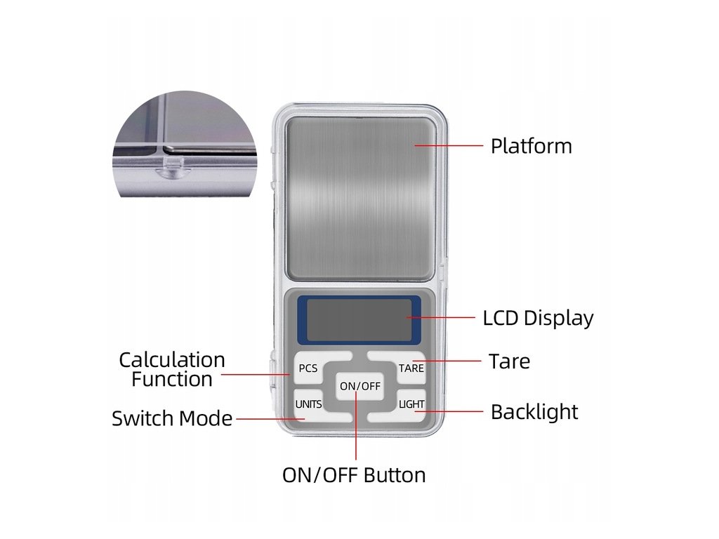 Produkt má malé rozměry: 12,2 × 6,4 × 2 cm, díky čemuž je velmi kompaktní – snadno se vejde do kabelky nebo dokonce do kapsy, takže jej můžete pohodlně přenášet a šetřit místo. Zařízení je uzavíratelné pomocí plastového víčka, které chrání misku a tlačítka váhy při přepravě. Váha je vybavena LCD displejem s modrým podsvícením, díky čemuž snadno a rychle odečtete výsledek měření.