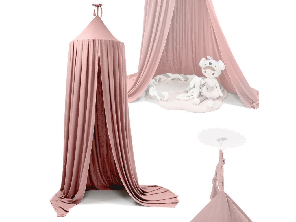 Baldachýn je vyroben z vysoce kvalitního materiálu, který je měkký na dotek a šetrný k dětské pokožce. Díky pečlivému zpracování materiál nedráždí a jemná růžová barva dodává prostoru lehký a elegantní charakter.