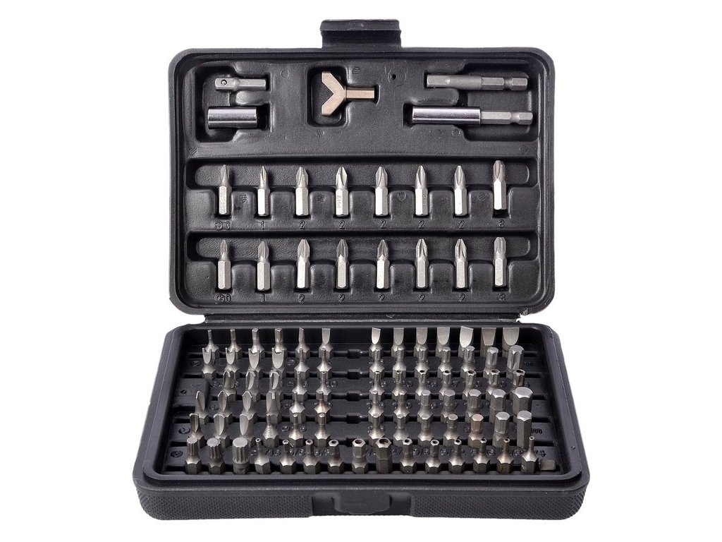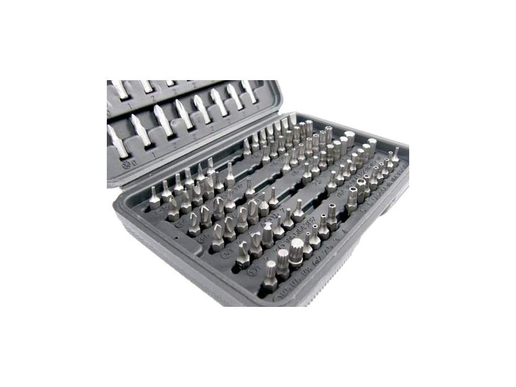 Sada bitů pro vrtačku 100 prvků z velmi kvalitních materiálů. Bity zabalené plastovém kufříku.