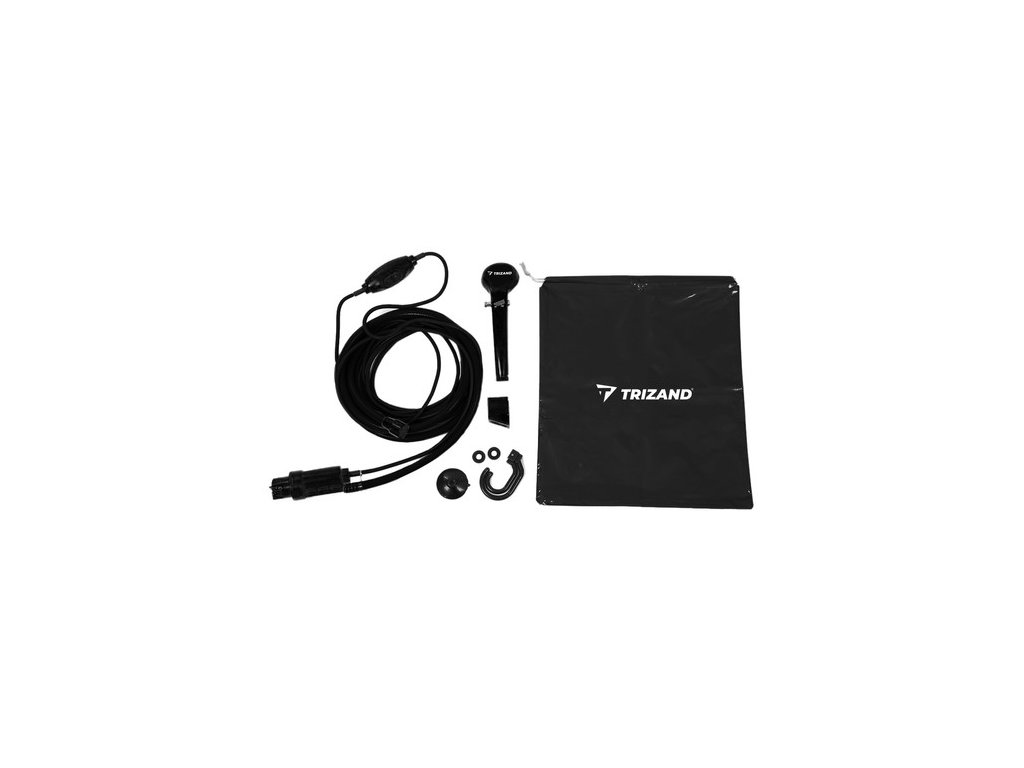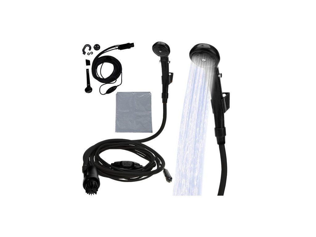Turistická sprcha pro napájení do auta TRIZAND 8877 s výkonným čerpadlem 3,5L za min. S filtrem, který udržuje sprchu v dobrém stavu. Nastavení proudu vody. Držák s přísavkou k zavěšení. Všestranné využití nejen ke sprchování. Taška na uschování nebo jako nádržka na vodu.